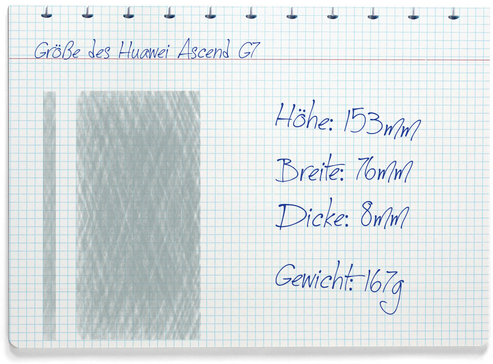 Das Ascend G7 ist ca. 153 mm hoch, 76 mm breit und etwa 8 mm dick. Die meisten Smartphones sind dicker.