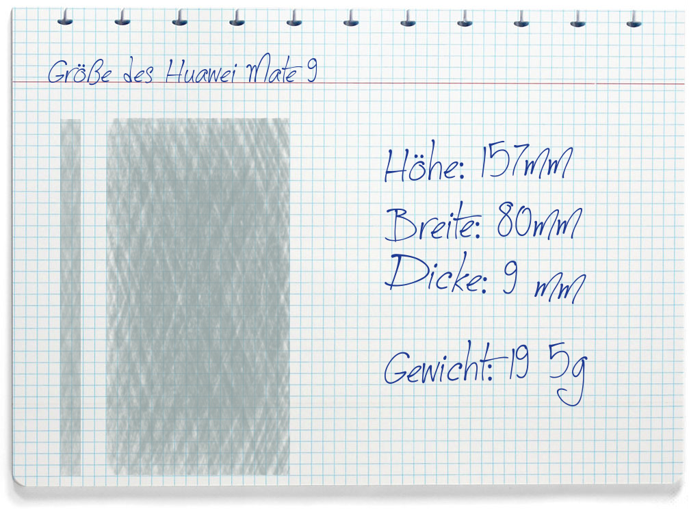 Das Mate 9 ist ca. 157 mm hoch, 80 mm breit und etwa 9 mm dick. Die meisten Smartphones sind dicker.