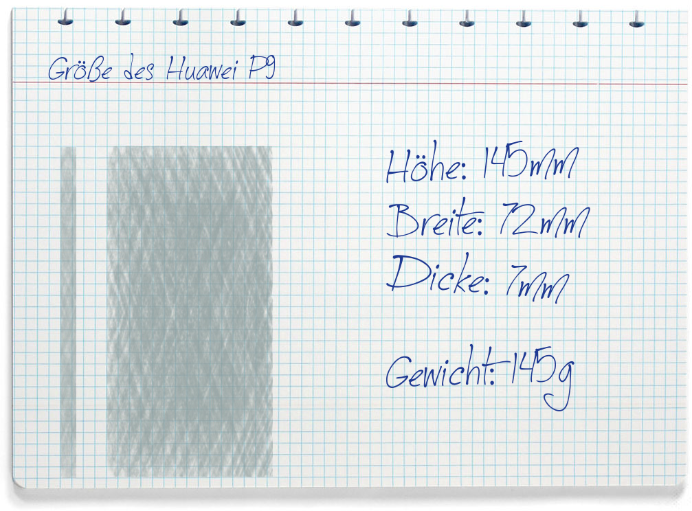 Das P9 hat folgende Abmessungen: 145mm x 72mm x 7mm (Höhe/Breite/Dicke). Damit ist es dünner als das Durchschnitts-Smartphone.