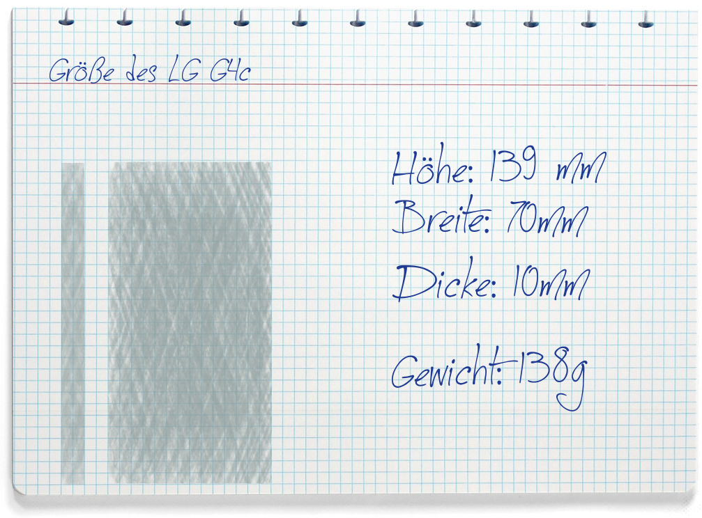 Das G4c ist ca. 139 mm hoch, 70 mm breit und etwa 10 mm dick. Es ist etwas dicker als das Durchschnitts-Smartphone.