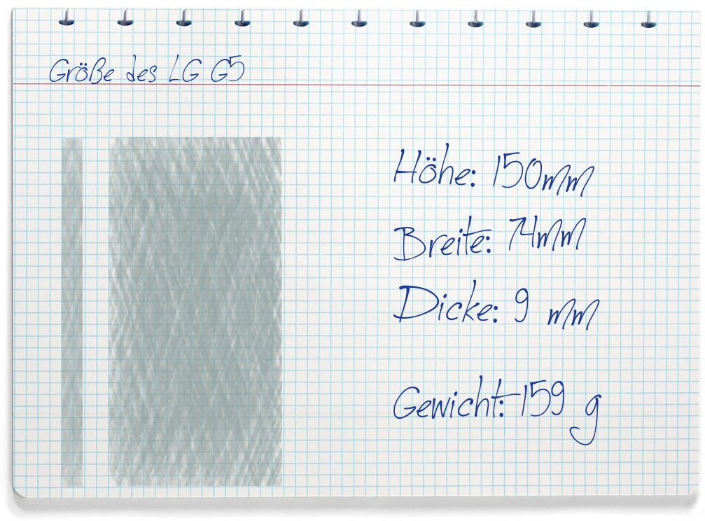 Das G5 ist ca. 150 mm hoch, 74 mm breit und etwa 9 mm dick. Die meisten Smartphones sind dicker.