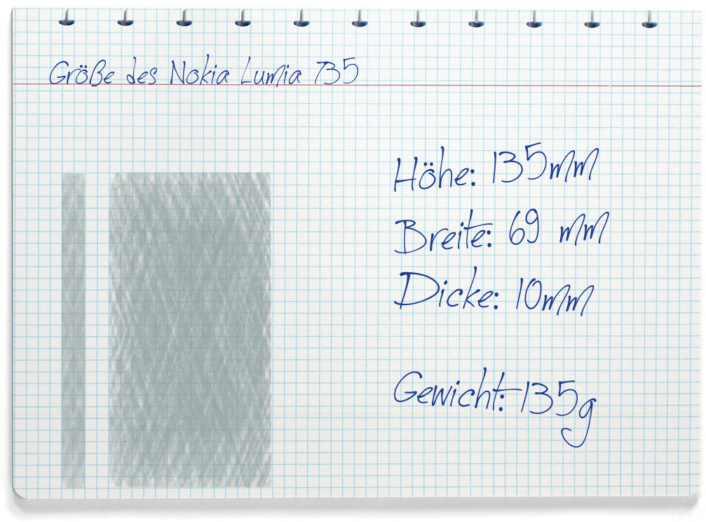 Das Lumia 735 ist 135 mm hoch, 69 mm breit und ca. 10 mm dick. Es ist etwas dicker als das Durchschnitts-Smartphone.