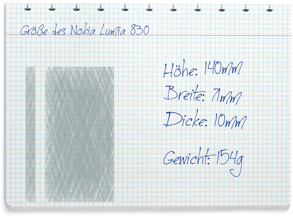 Das Lumia 830 ist ca. 140 mm hoch, 71 mm breit und etwa 10 mm dick. Es ist etwas dicker als das Durchschnitts-Smartphone.