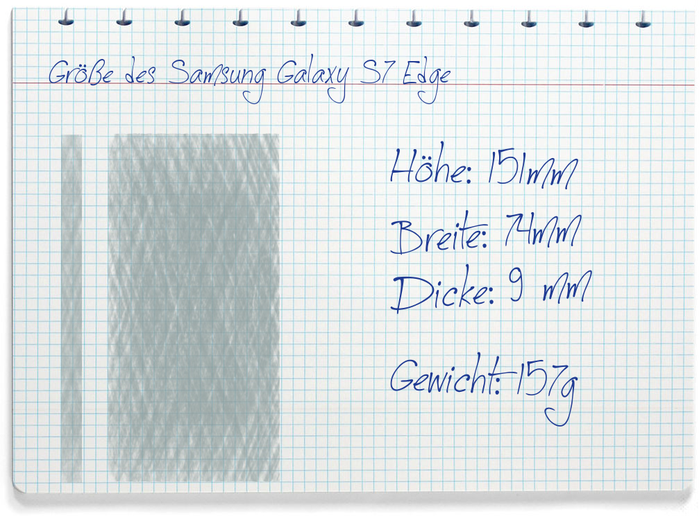 Das Galaxy S7 Edge hat folgende Abmessungen: 151mm x 74mm x 9mm (Höhe/Breite/Dicke). Die meisten Smartphones sind dicker.