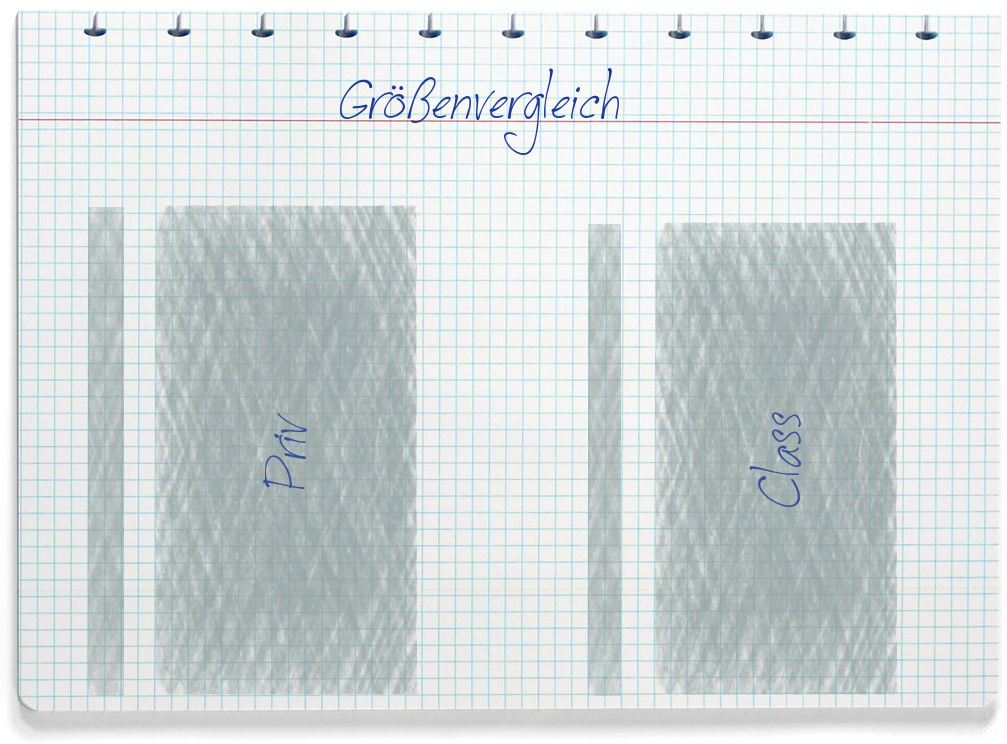 Das größere Smartphone ist das Blackberry Priv. Das Priv hat folgende Abmessungen: 147mm x 78mm x 11mm (Höhe/Breite/Dicke). Das Class hat diese Abmessungen: 142mm x 72mm x 10mm (Höhe/Breite/Dicke).