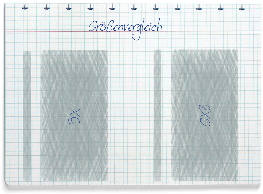 Das größere Smartphone ist das Huawei GX8. Das 5X hat diese Abmessungen: 151mm x 77mm x 9mm (Höhe/Breite/Dicke). Das GX8 hat diese Abmessungen: 152mm x 77mm x 9mm (Höhe/Breite/Dicke).