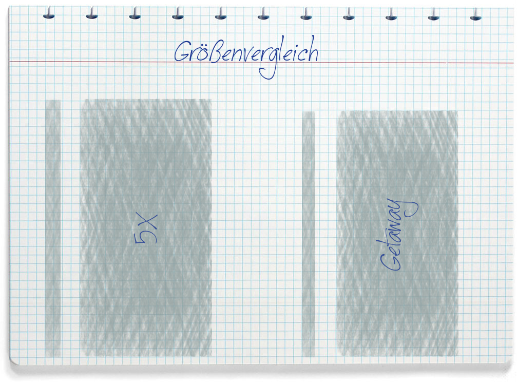 Das Wiko Getaway ist kleiner als das Honor 5X. Das 5X hat diese Abmessungen: 151mm x 77mm x 9mm (Höhe/Breite/Dicke). Das Getaway ist etwa 144 mm hoch, 71 mm breit und ca. 8 mm dick.