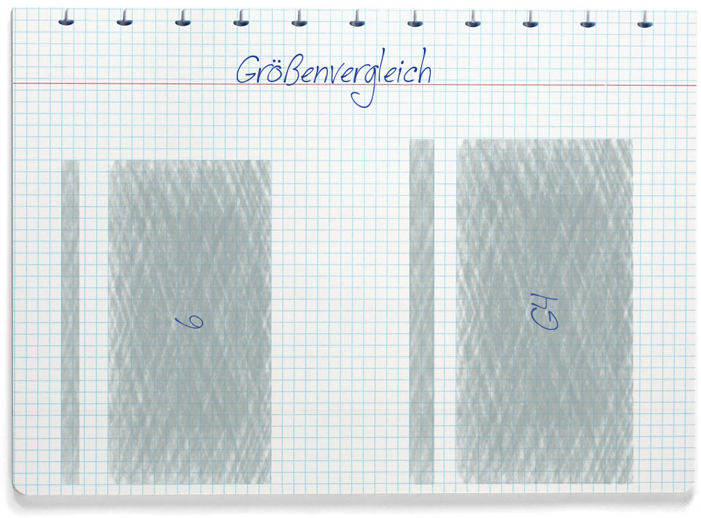 Das größere Smartphone ist das LG G4. Das 6 ist etwa 140 mm hoch, 70 mm breit und ca. 8 mm dick. Das G4 hat diese Abmessungen: 149mm x 76mm x 11mm (Höhe/Breite/Dicke).