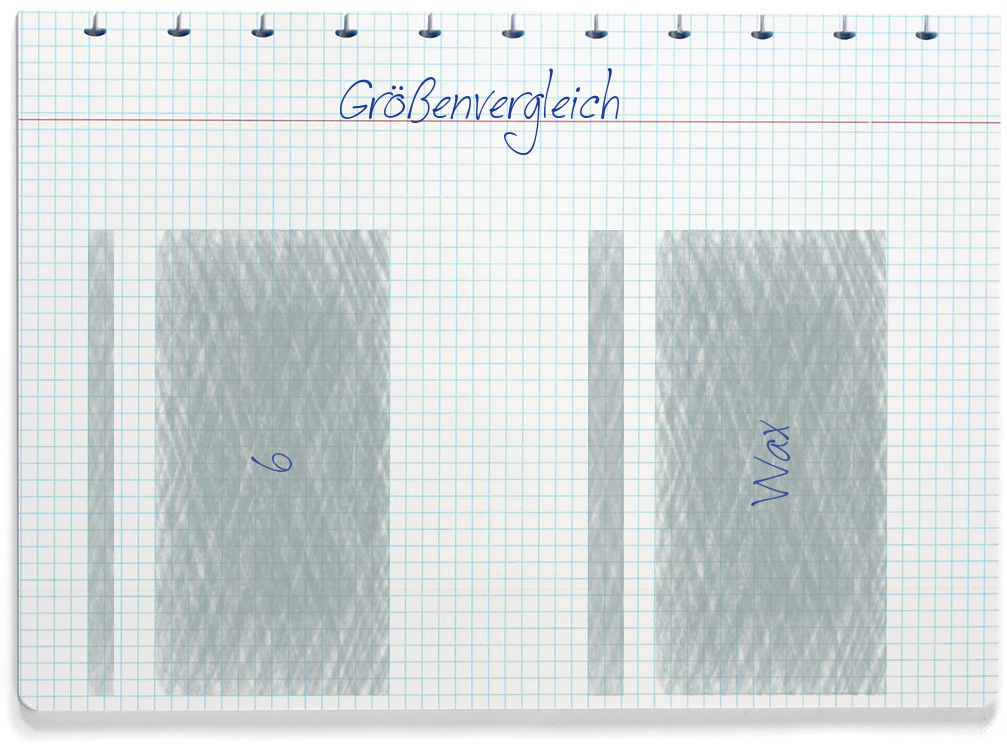 Beide Geräte sind etwa gleich groß: Das 6 hat folgende Abmessungen: 140mm x 70mm x 8mm (Höhe/Breite/Dicke). Das Wax ist ungefähr 140 mm hoch, 69 mm breit und ca. 11 mm dick.