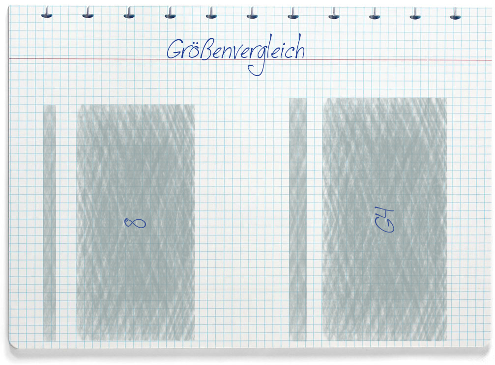 Das größere Smartphone ist das LG G4. Das 8 ist ca. 145 mm hoch, 72 mm breit und ungefähr 8 mm dick. Das G4 ist etwa 149 mm hoch, 76 mm breit und ca. 11 mm dick.