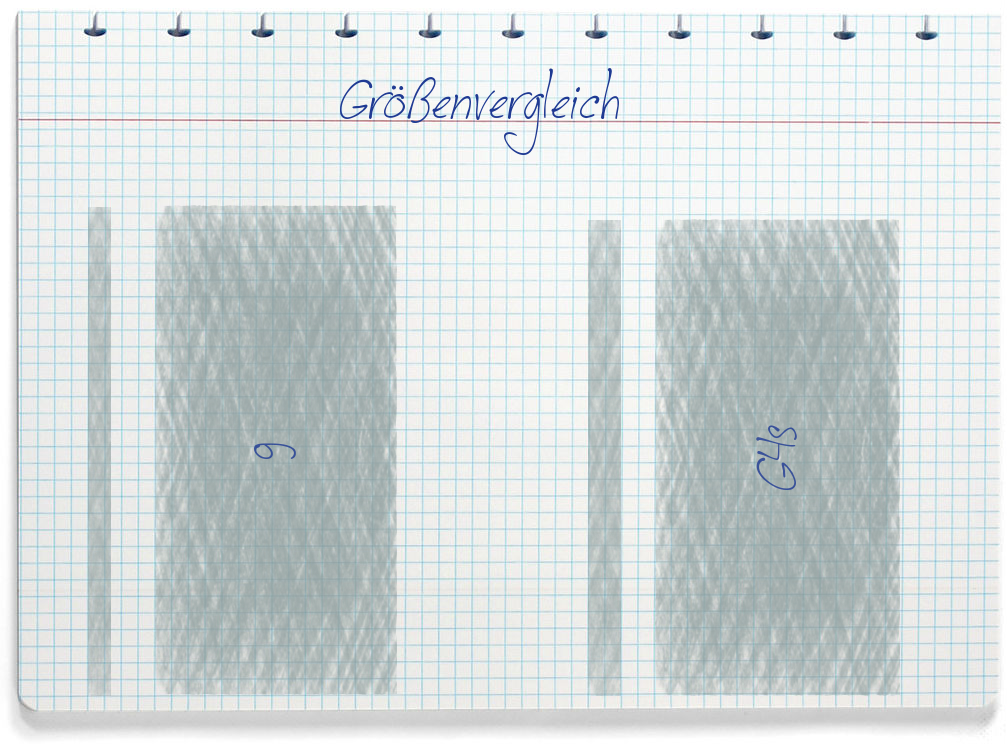 Das kleinere der beiden Smartphones ist das LG G4s: Das 9 ist 147 mm hoch, 72 mm breit und ca. 7 mm dick. Das G4s hat diese Abmessungen: 143mm x 73mm x 10mm (Höhe/Breite/Dicke).