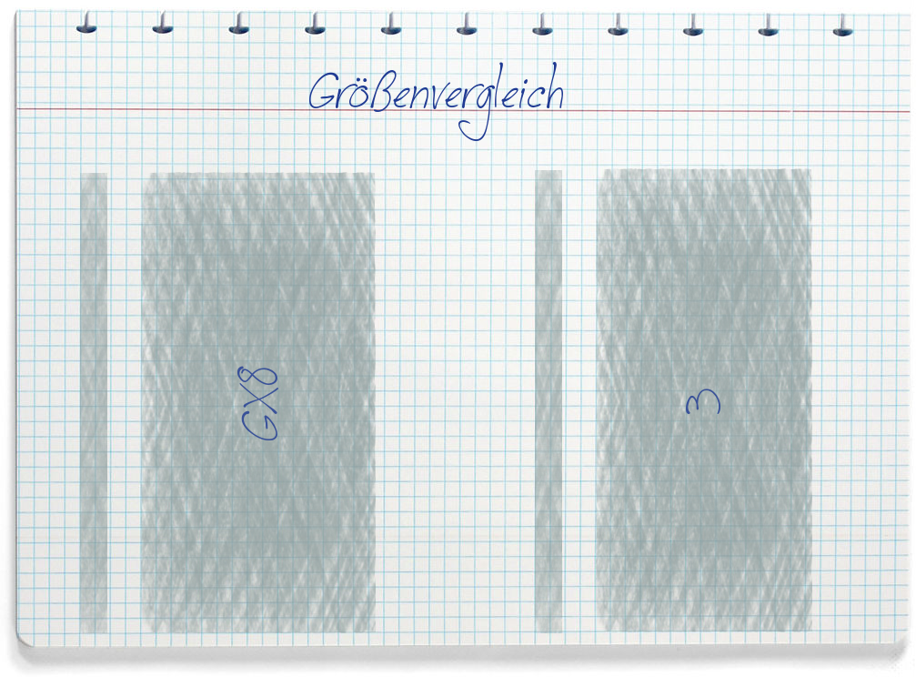 Die Auflösung beträgt beim GX8 1080 x 1920 Pixel. Auf das Display vom 3 passen 1.080 x 1.920 Pixel.