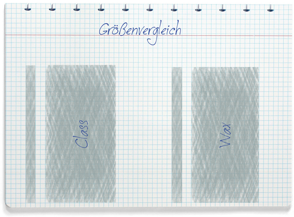 Das größere Smartphone ist das LG Class. Das Class ist 142 mm hoch, 72 mm breit und ca. 10 mm dick. Das Wax ist ca. 140 mm hoch, 69 mm breit und ungefähr 11 mm dick.