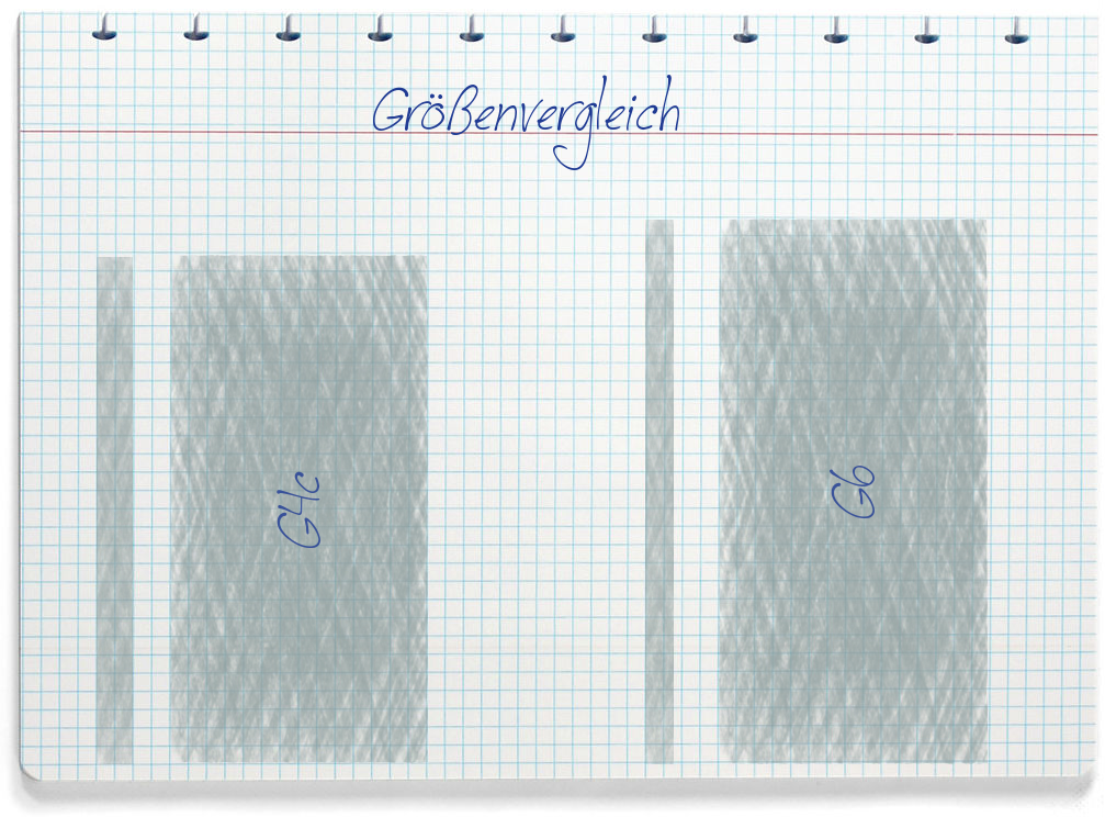 Das LG G6 ist größer als das LG G4c. Das G4c ist 139 mm hoch, 70 mm breit und ca. 10 mm dick. Das G6 ist ungefähr 149 mm hoch, 73 mm breit und ca. 8 mm dick.