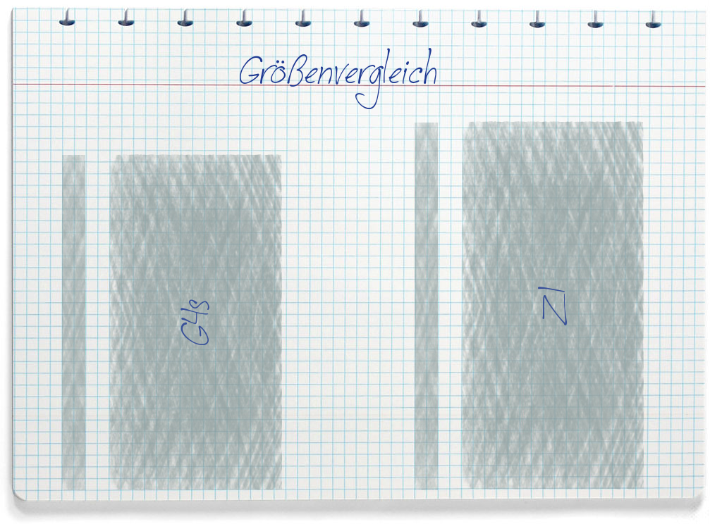 Das größere Smartphone ist das ZUK Z1. Das G4s hat folgende Abmessungen: 143mm x 73mm x 10mm (Höhe/Breite/Dicke). Das Z1 ist ungefähr 157 mm hoch, 77 mm breit und ca. 10 mm dick.